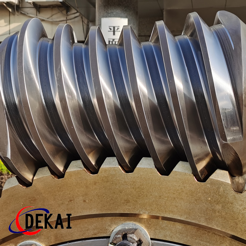 承載能力大:平面二次包絡(luò)環(huán)面蝸桿能多齒同時(shí)進(jìn)去嚙合,增大了接觸面積,減少了齒面壓力,承受大的沖擊載荷。蝸桿蝸輪的接觸線是沿齒高方向上,并且齒面的嚙合是在接觸線上,具有很小的相對(duì)曲率,使接觸應(yīng)力減少。蝸桿和蝸輪在嚙合中同時(shí)有兩條接觸線進(jìn)入工作區(qū)域。這種增加嚙合齒數(shù)一樣,可提高承載能力磨削的蝸桿齒面,表面粗糙度Ra0.8。高質(zhì)量的蝸桿幾何尺寸和表面粗糙度,保證耐磨防止大負(fù)荷時(shí)油膜破壞。蝸桿的齒面是經(jīng)過(guò)氮化熱處理后精制而成,齒面硬度HRC≥58,高硬度的蝸桿在設(shè)計(jì)上保證有足夠的剛性以致于他的彎曲和其它因素不影響上述嚙合特性。
